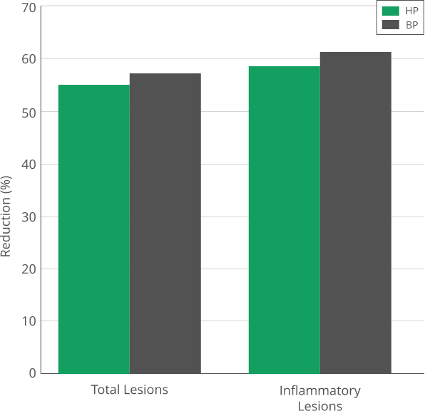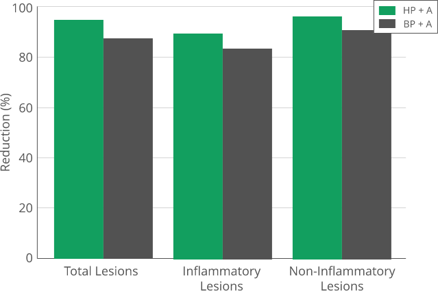 - 90% reduction in inflammatory lesions with HP + A vs. 86% with BP + A