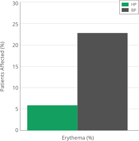 - Redness (erythema): 6% of patients with HP vs. 23% with BP
