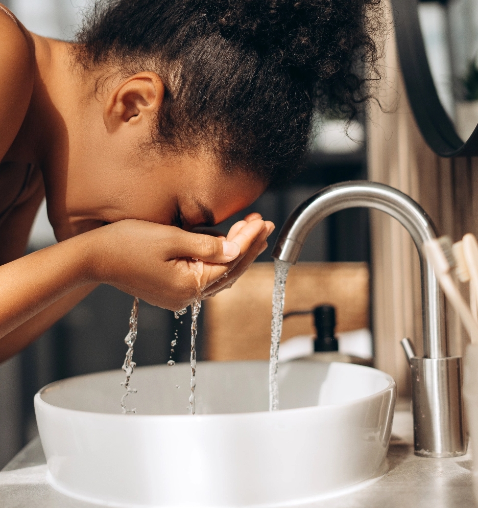 - Répartir le produit sur le front, chaque joue, le menton et étaler en fine couche en évitant le contour des yeux.